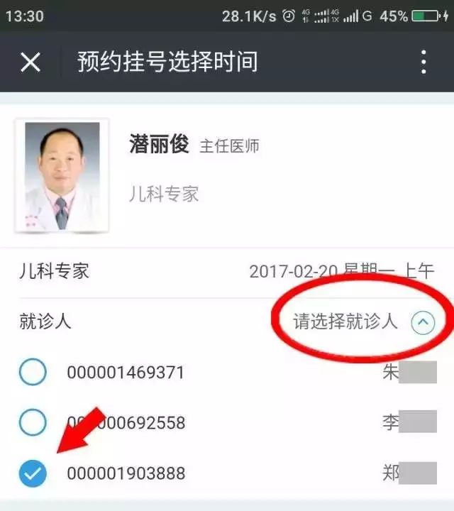 2、選擇科室及醫(yī)生,輸入個(gè)人信息(如姓名、身份證號等)。