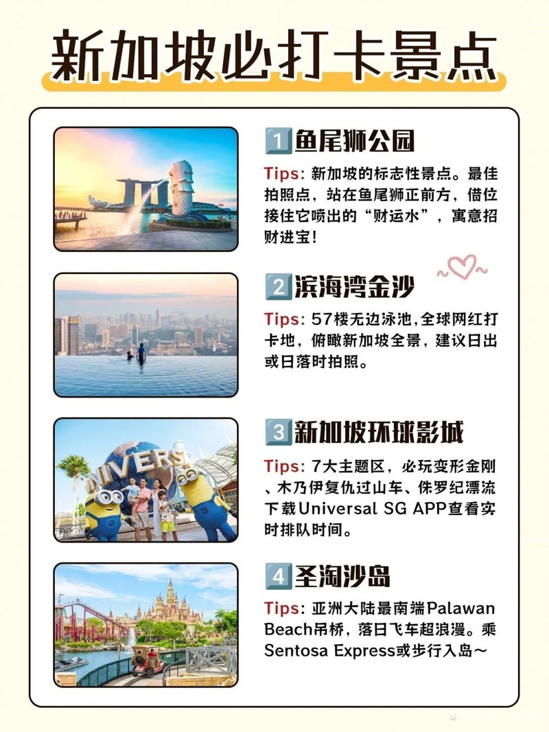 新加坡的旅游景點(diǎn)豐富多樣,無(wú)論是自然風(fēng)光、人文景觀還是現(xiàn)代娛樂(lè)設(shè)施,都能讓游客們留下深刻的印象,在游玩新加坡的過(guò)程中,您可以根據(jù)自己的興趣和喜好選擇合適的景點(diǎn)進(jìn)行游覽,希望本文能為您的新加坡之行提供有益的參考和幫助。